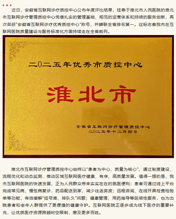 淮北市互联网医院质控中心连续两年蝉联全省第一 我市互联网诊疗服务能力与便民成效双提升