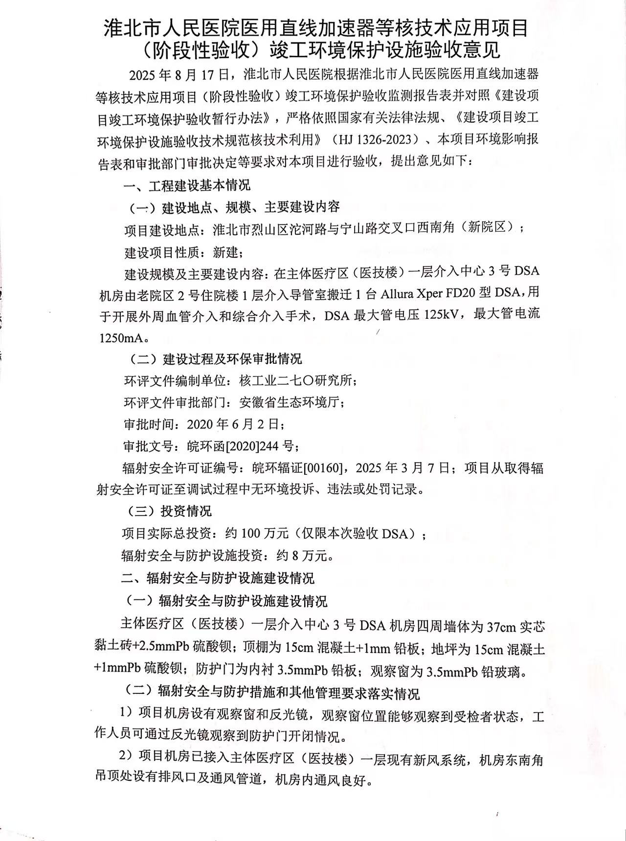 淮北市人民医院新院医用直线加速器等核技术应用建设项目竣工环境保护验收监测报告及意见
